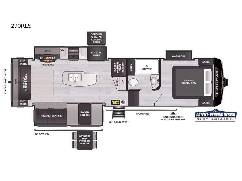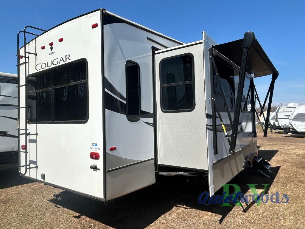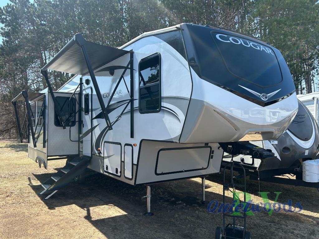 Spend more time having fun and less time worrying about your RV with the Keystone Cougar fifth wheel! These units have all that you will need for excellent vacations. The interior comes with 5/8" one-piece DynaSpan® flooring, tall slide outs for added comfort and head room, night roller shades throughout, residential, raised-panel hardwood cabinet doors and drawers, decorative crown molding, a 5,500 BTU electric fireplace with thermostat control and remote, and a Max Air exhaust fan with rain sensor. The exterior is also fully outfitted with a convenience center, friction-hinge entry door, electric four-point auto leveling system, an LCI® SolidStep® on main entry, a full pass-through storage with slam-latch baggage doors, an industry-best 80-gallon fresh tank capacity, a 2" accessory hitch with 300-LB storage capacity, and an outside shower.