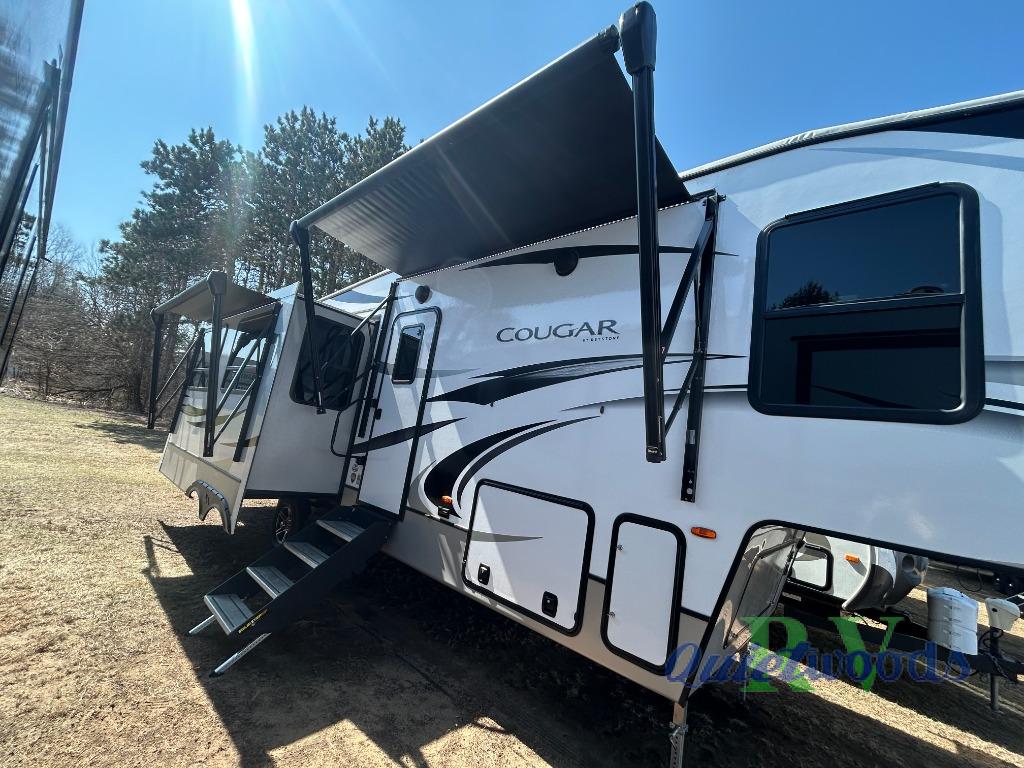 Gain some freedom to travel with this Cougar fifth wheel! You will be oh-so comfortable in the front private bedroom as you sleep on the queen-size bed, and the wardrobe slide and bedside wardrobes will provide you with clothing storage. You'll be right next to the full bathroom while you're in the bedroom, so you can easily step inside the bathroom for a quick rinse in the large shower with glass door and skylight. The main living area offers you more space with its opposing slides, and you'll be able to get comfortable each evening on the tri-fold sleeper sofa and theater seating.