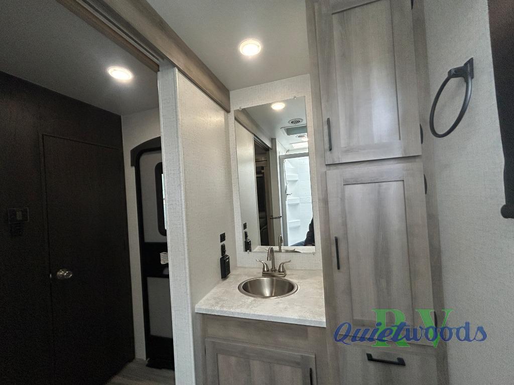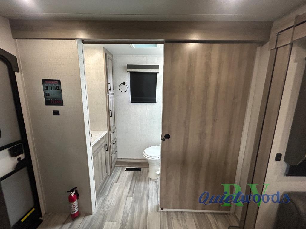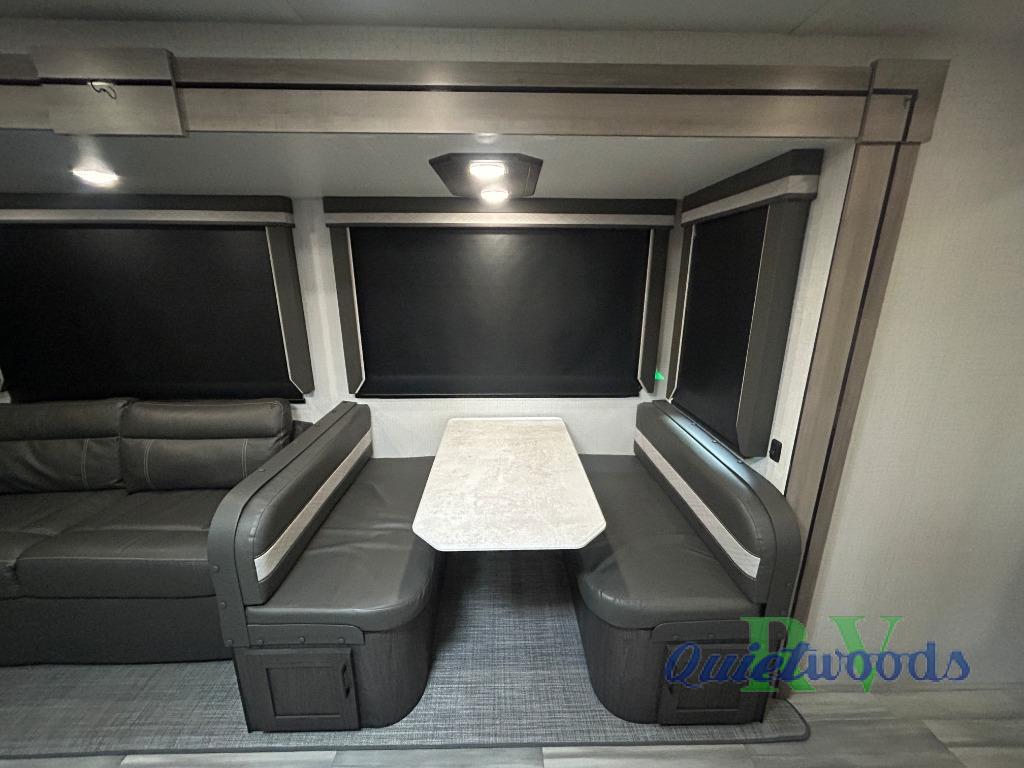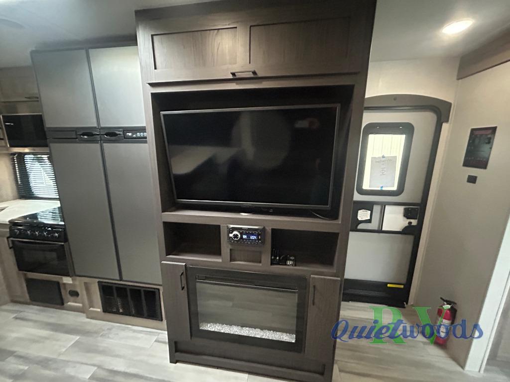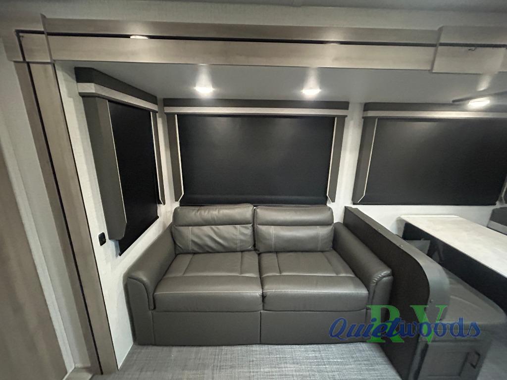 Convenience and comfort are found throughout as you return to your own accommodations after exploring the campgrounds. There are two entry doors so that you can choose to either enter the front private bedroom or the main living area. When you choose to enter through the main entrance, you will be met with a walk-in pantry to your right and a full rear bathroom to your left. That makes it very convenient when you are coming in after a muddy adventure so that you don't track dirt all throughout the trailer. Within the main living area there is a large slide that has a tri-fold sofa and booth dinette across from the kitchen area. You will love sitting back on these pieces of furniture while you watch the LED TV within the entertainment center across from you.