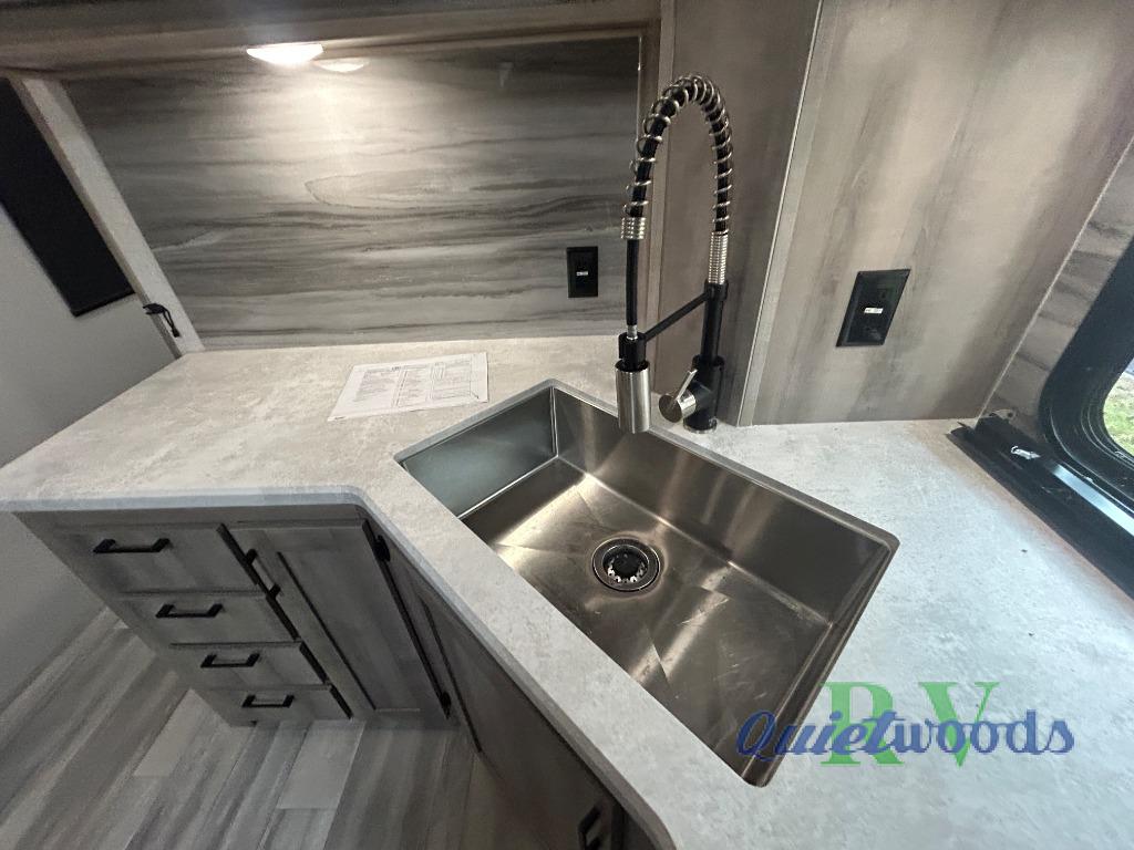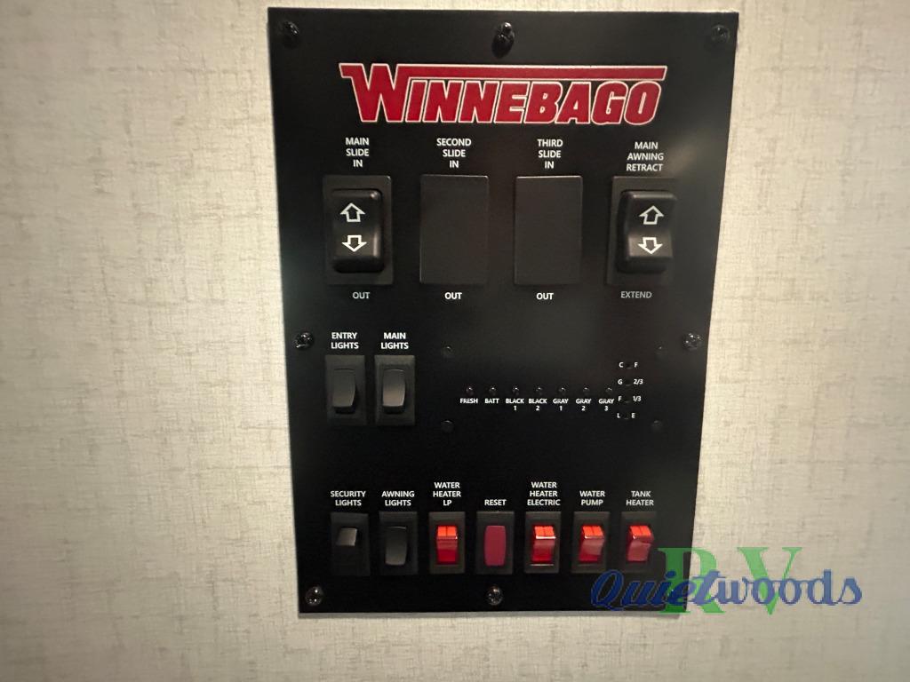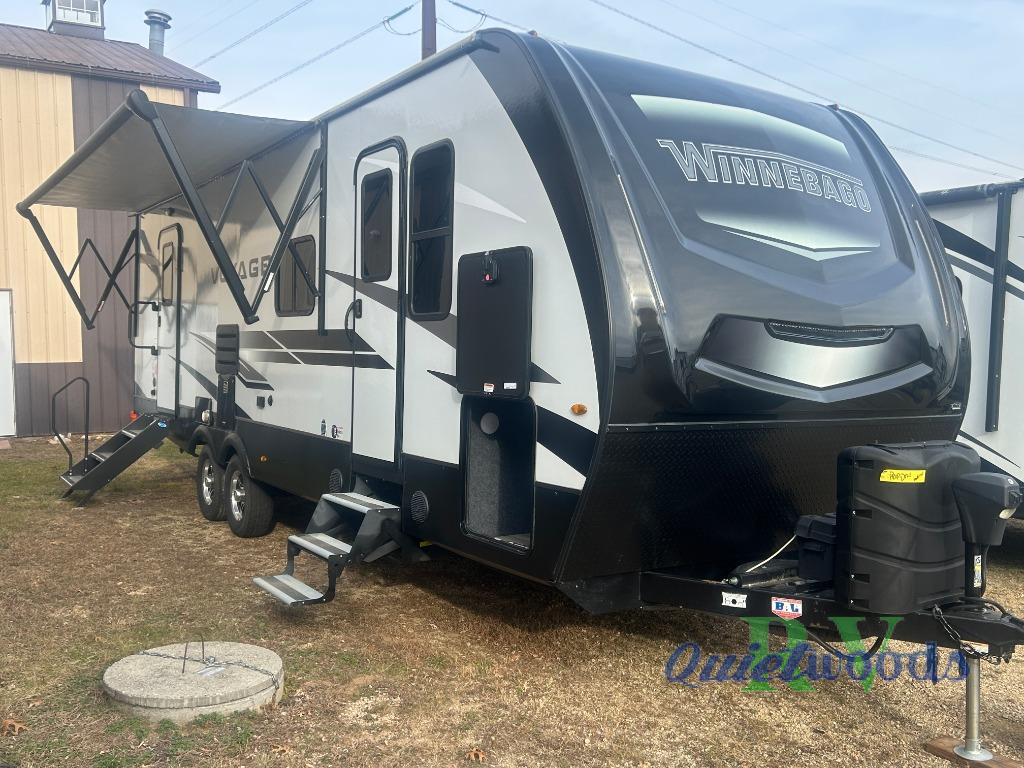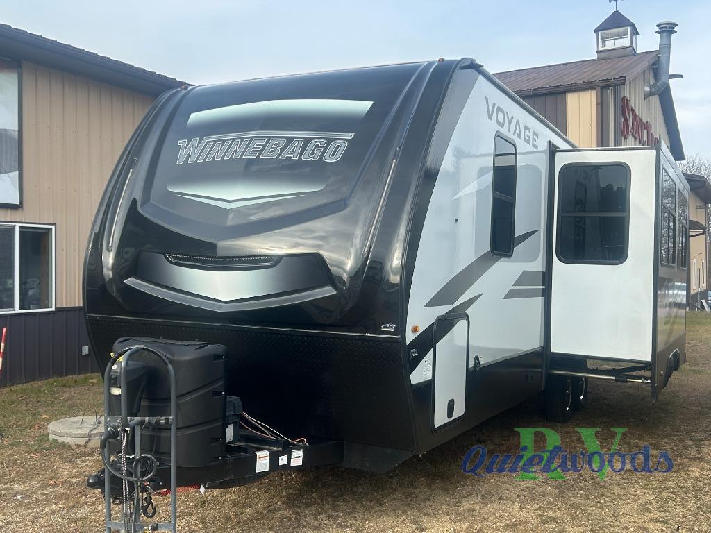 Each Voyage travel trailer by Winnebago Industries Towables includes two 100-watt solar panels with a charge control monitor so you can camp off-grid, satellite and antenna connections, and an antenna with wifi prep. Also included is a heated and enclosed underbelly with thermo foil insulation for four seasons of travel, a gel coat fiberglass front cap with integrated LED lighting, walk-on roof decking, plus four-point power/electric stabilizers for easy setup and stability. The interior offers comforts of home, large windows, ceiling LED lights, ductless flooring throughout, and full kitchen amenities. No voyage is better than the one taken in the Voyage travel trailer!