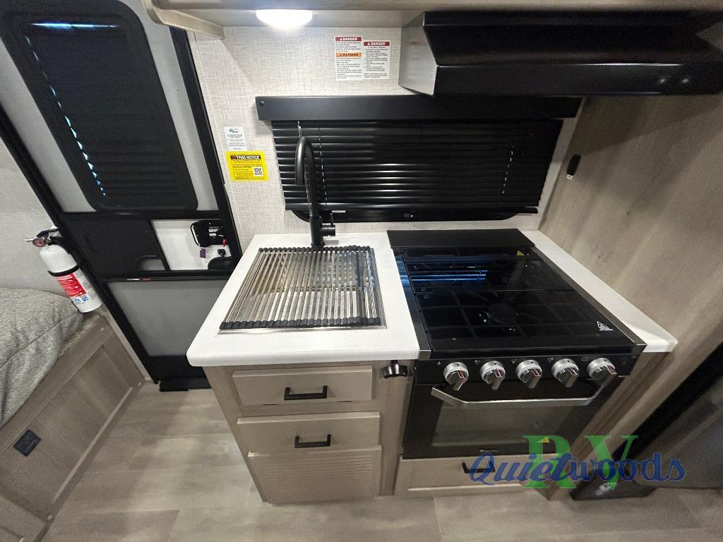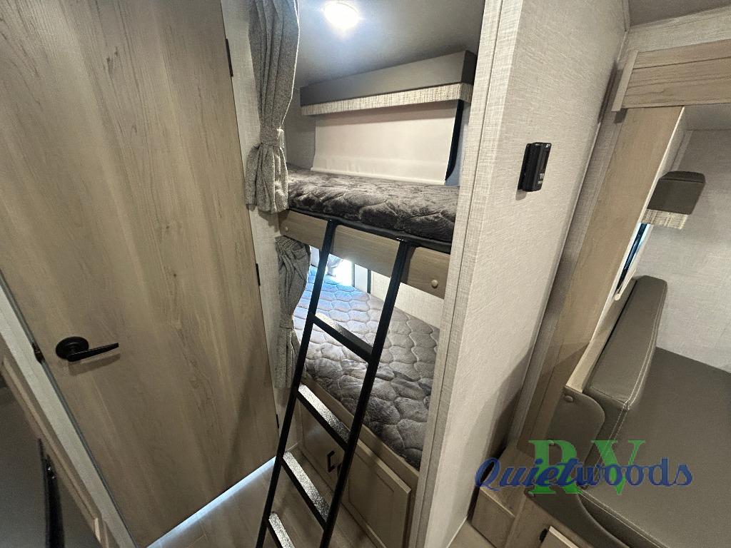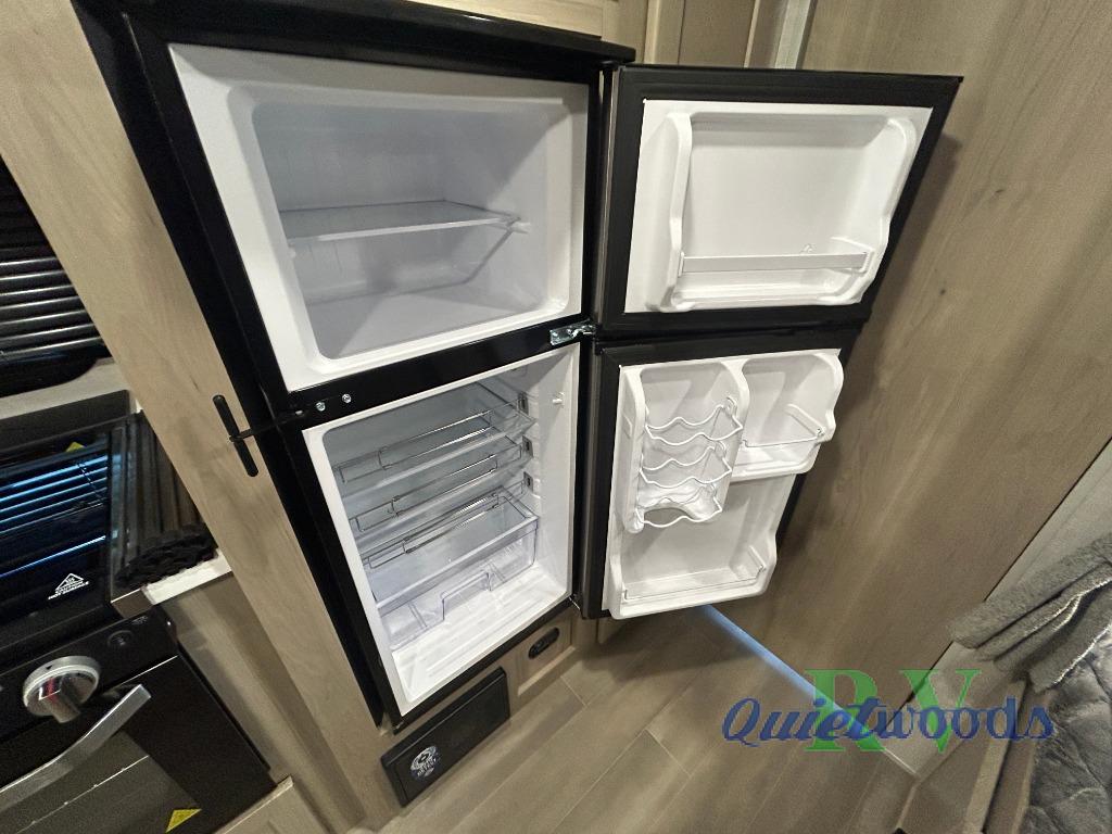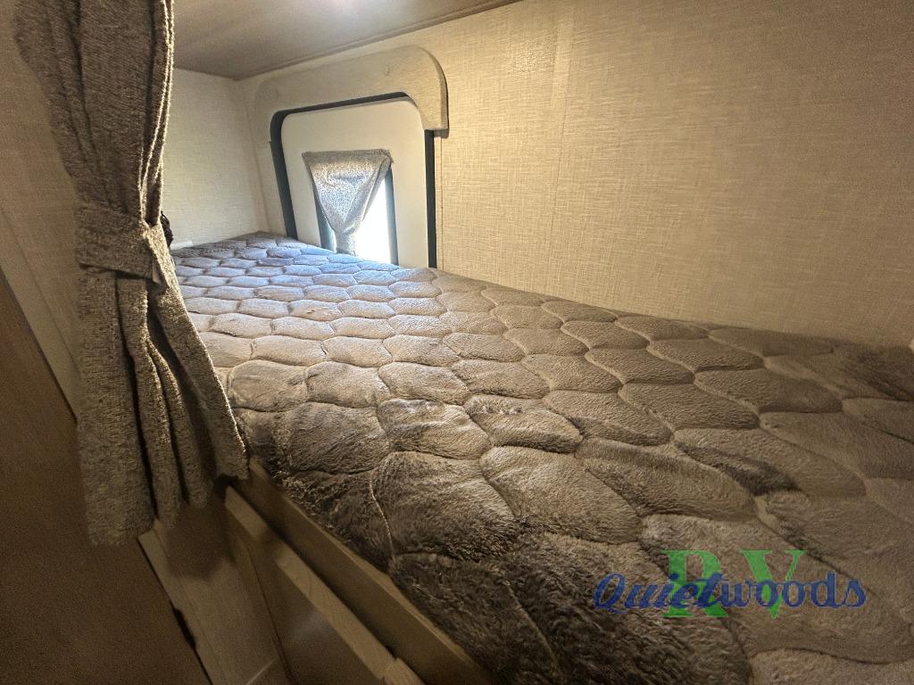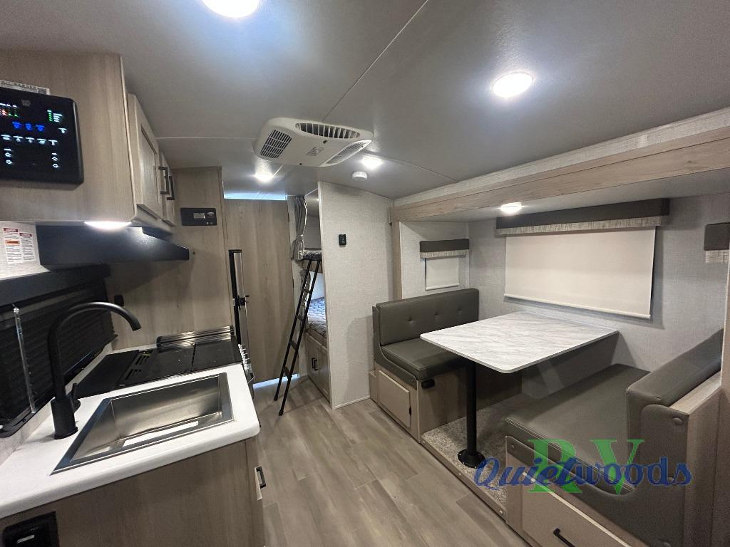 The largest bunk trailer in the E-Pro lineup will work perfectly for a family or friend group that enjoys their own sleeping space, plus more floor space with the dinette slide out that can sleep one to two. The bottom bunk even flips up so you can stow away your bikes, totes and such through the bike door for secure travels. There is exterior storage for more outdoor gear, and interior storage found throughout. The cook will love having a pantry and overhead cabinets for snacks, canned goods, dishes and more. After making a warm meal, the 12V refrigerator can hold the leftovers. The private toilet and shower/tub room gives you privacy and a place to get cleaned up after a fun day outdoors.