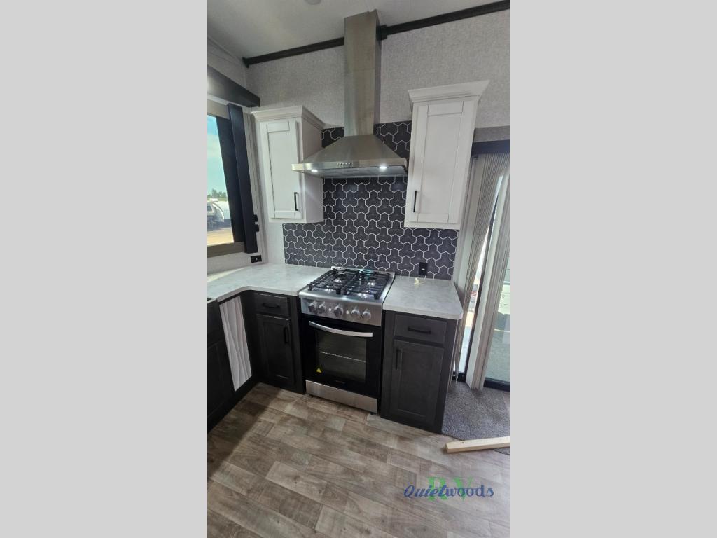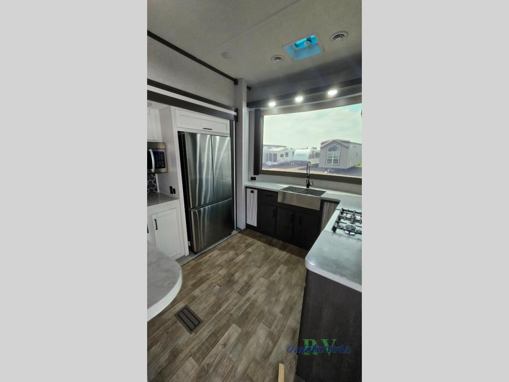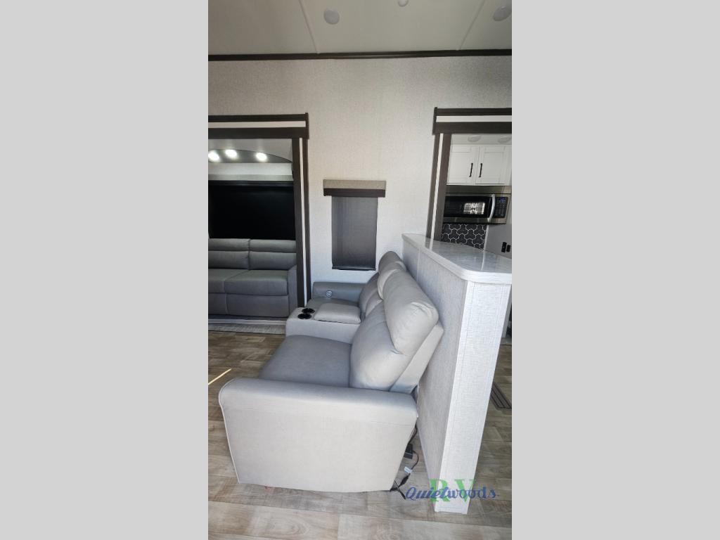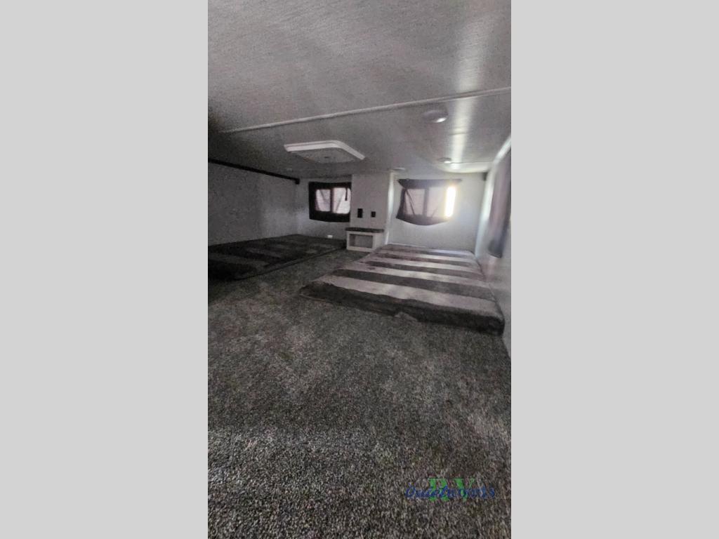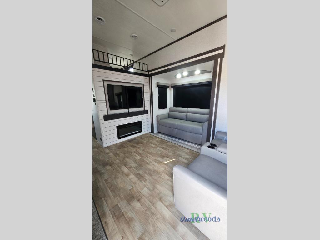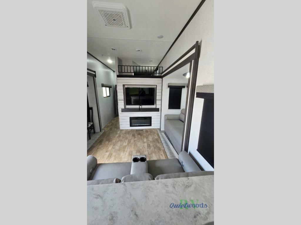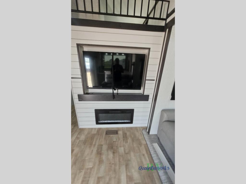 Are you looking for a destination trailer that can fit your whole crew? Look no further than this unit with four slides, three bunk mats in the loft areas, plus a spacious full bath that will allow everyone to stay clean each day. The front kitchen is any chef's dream with its ample counter space, pantry/cabinet, residential four burner range, and residential refrigerator. After dinner is cleaned up, everyone can meet in the middle living area to watch a movie on the 50" TV, and the fireplace here will make it feel more like home.
