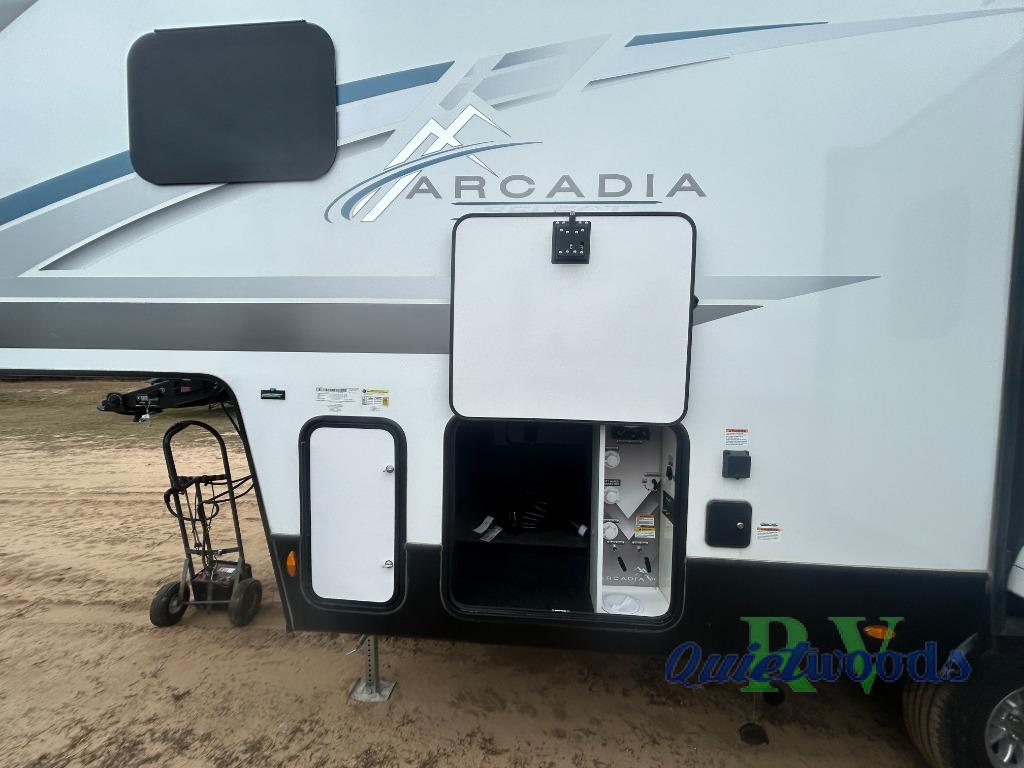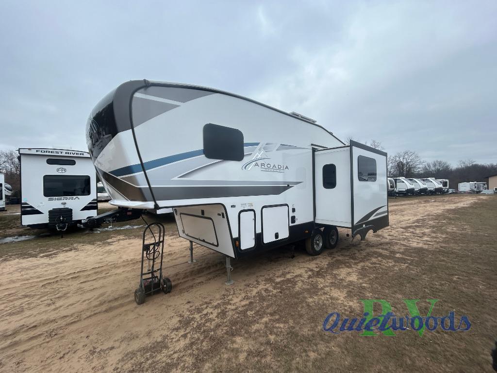 With any Arcadia Select fifth wheel by Keystone you will enjoy easy towability and at-home comforts at an affordable price! The laminated sidewalls with five sided aluminum superstructure will provide a strong foundation so you can enjoy your RV for years to come, plus a one-piece, heated and enclosed polypropylene underbelly means you can camp year around! And an upgraded Roto-Flex hitch pin with MaxTurn technology, Road Armor rubberized equalization suspension system and Dexter Nev-R-Adjust electric brakes will make it easy to tow. Head inside to find tall slides for added space, seamless, pressed countertops, convenient underbed storage, and a large shower with a retractable door and skylight. These fifth wheels also include a Blade Pure A/C system, Girard on-demand tankless water heater, two 30 lb. LP tanks, and more utilities to make your camping experience run smoothly.